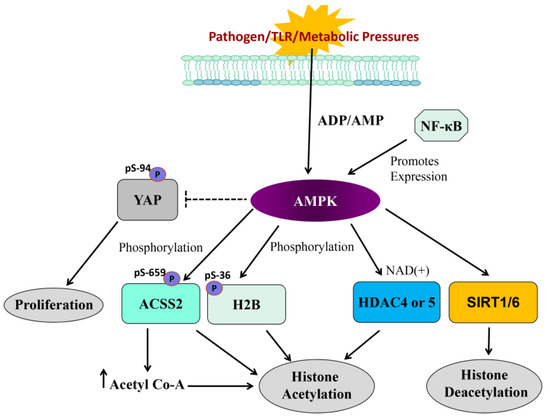 AMPK-related pathways. AMPK is a master regulator of metabolic pathways that can influence inflammatory and growth pathways as reviewed elsewhere [95,101]. AMPK activation can be triggered by pathogen attack, TLR activation or NFκB activation. AMPK effect on histone modifications (and with effect on sirtuins) links a metabolic sensor to a modifier of DNA and gene transcription. The effect on histones occurs in parallel with the AMPK control of serine-94 on YAP and possibly S61 and threonine [T] 119 phosphorylation on YAP. These YAP phosphorylation events will interfere with its ability to be a transcriptional co-activator and mostly be retained in the cytoplasm. Glucose Transporter Type 3 (GLUT3) expression is a target of YAP biology and will be affected by varying AMPK activities, altering glucose access to cancer cells. Thus, these observations illustrate the importance of AMPK beyond metabolic control. ASCC2, Activating Signal Cointegrator 1 Complex Subunit 2; HDAC, histone deacetylase; SIRT, sirtuin. Arrows represent activating signals while others represent inhibitory outcomes.