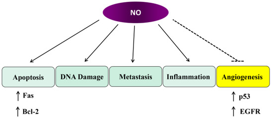 It is known that NO is generated from the L-arginine by three functional classes of nitric oxide synthase (NOS): the neuronal NOS (nNOS/NOS1), the endothelial NOS (eNOS) and the inducible NOS (iNOS). It is currently known that NO is produced by both tumor and stromal cells in the tumor microenvironment. It has been demonstrated that iNOS is involved in the activation pathways of matrix metalloproteinase (MMP)-1, -2, -3, -8, -9 and thus can promote extracellular rearrangements related to carcinogenesis and metastasis [111]. iNOS can be transcriptionally regulated by HIF-1α, STAT and NFκB to result in an increased generation of NO in cancer. Thus, iNOS can promote tumor-induced inflammation, leading to increased carcinogenesis [113]. Furthermore, the increased iNOS expression levels in cancers appear to correlate with poor patient survival. iNOS inhibitors inhibit tumor growth, increase sensitivity to chemotherapy and aid in immunotherapy (such as aiding cisplatin efficacy). iNOS expression may be an interesting biomarker for tumor progression and patient prognosis. That said, it is worth mentioning that controversially, iNOS has been demonstrated to have an anti-cancer role and it may well be that the expression levels of iNOS are what dictates its biological function in specific cell types [110]. NO levels can vary considerably with high levels leading to DNA damage, p53 activation and apoptosis to improve chemotherapeutic efficacy and thus anti-cancer effects [114].