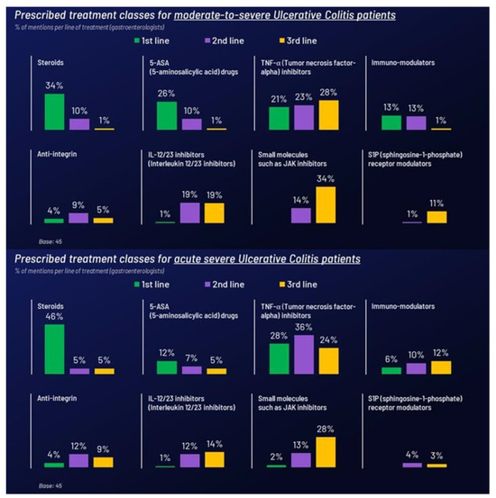 Most prescribed treatment classes for UC as first-, second-, and third-line therapy.