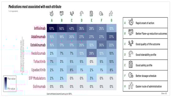 HCPs were asked to choose medications most associated with certain attributes such as rapid onset of action, better flare-up reduction outcomes, and good quality of life. Infliximab is the top choice for its rapid onset of action, superior flare-up reduction, and significant improvement in quality of life. However, regarding safety, infliximab, adalimumab, and vedolizumab were all ranked similarly as highest (Figure 2).