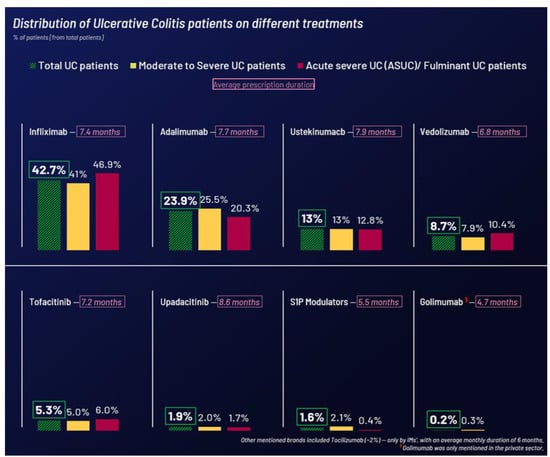 As shown in Figure 3, infliximab was prescribed to nearly 43% of all UC patients (moderate to severe or acute severe), followed by adalimumab at 24%. Ustekinumab and vedolizumab are utilized less frequently. HCP reports that around 80% of patients fully comply with biologic and small-molecule treatments. Decisions to stop or switch treatments are mainly made when symptomatic or clinical remission is not achieved.