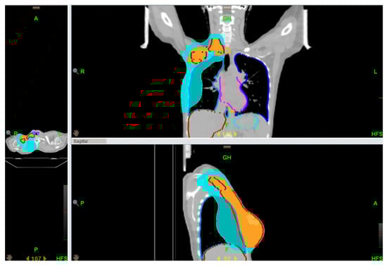 Target volumes and OARs were contoured according to both national guidelines and the breast cancer atlas of the Italian Association of Radiotherapy ad Clinical Oncology (AIRO) and ESTRO [13,14]. Contouring and treatment planning was performed using Eclipse® version 8.6 (Varian Medical Systems, Palo Alto, CA, USA) and Raystation version 11a (RaySearch Laboratories AB, Stockholm, Sweden). Planning was performed for both cohorts in TomoTherapy VoloTM. The clinical target volumes (CTVs) comprised the chest wall, level II–III axillary nodes, and the supraclavicular region (Figure 1). In accordance with standard clinical practice, the temporary TE was fully inflated prior RT. When clinically needed (e.g., for skin involvement or inflammatory tumors), a 5 mm tissue equivalent bolus was applied for half a treatment to increase the surface dose.