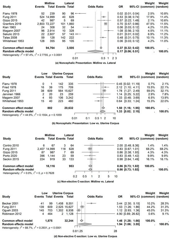 We identified nine studies that were used to compare the odds of identifying non-cephalic presentation based on examinations of placental location using midline versus lateral location. The combined data from the midline location were 94,764 observations compared to 3505 cases with placenta in the lateral location. The odds of identifying non-cephalic presentation for examinations with midline placental location are 0.17 times (95% CI: 0.06, 0.51) the odds of lateral placental location (see Figure 2). The pooled proportion of non-cephalic presentation based on midline location was 0.14 (95% CI: 0.06, 0.23) compared to 0.41 (95% CI: 0.17, 0.65) using lateral location. In follow-up, we examined the odds of identifying non-cephalic presentation based on examinations of low uterine segment versus uterine corpus. A total of six studies were utilized for this comparison (see Figure 2). The pooled proportion of non-cephalic presentation based on the low uterine segment was 0.18 (95% CI: 0.03, 0.32) compared to 0.20 (95% CI: 0.07, 0.32) using uterine corpus. While the odds of identifying non-cephalic presentation based on low uterine segment examinations were 33% higher compared to uterine corpus, they were not statistically significant (OR = 1.33; 95% CI: 0.82, 2.15).