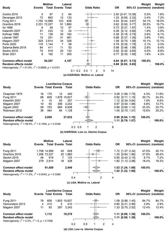 We identified 13 studies that were used to compare the odds of FGR/SGA based on examinations of placental location using midline versus lateral location. The combined data from the midline location were 94,207 observations compared to 4187 cases with lateral placenta location. The odds of FGR/SGA for examinations based on midline are 0.68 times (95% CI: 0.55, 0.85) the odds of lateral examinations (see Figure 4). The pooled proportion of FGR/SGA based on a midline location was 0.10 (95% CI: 0.07, 0.12) compared to 0.13 (95% CI: 0.09, 0.17) using a lateral location. As a follow-up set of analyses, we examined the odds of FGR/SGA based on examinations of the low uterine segment versus uterine corpus. A total of six studies were utilized for this comparison (see Figure 4). The pooled proportion of FGR/SGA based on the low uterine segment was 0.09 (95% CI: 0.08, 0.11) compared to 0.10 (95% CI: 0.07, 0.12) using uterine corpus. While the odds of FGR/SGA based on low uterine segment examinations were 11% higher compared to uterine corpus, it was not statistically significantly different (OR = 1.11; 95% CI: 0.79, 1.57).
