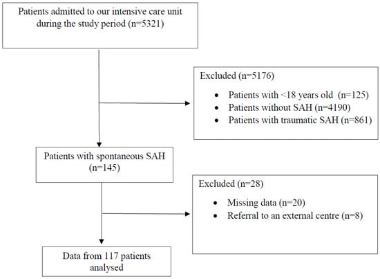 During the study period, 121 patients with spontaneous SAH were admitted to the ICU and data from 117 patients who met the inclusion criteria were analysed (Figure 1).