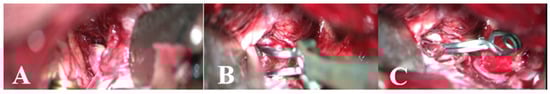 Aneurysm of the anterior cerebral artery (A), surgical microclip procedure (B), aneurysm following microclip procedure (C).
