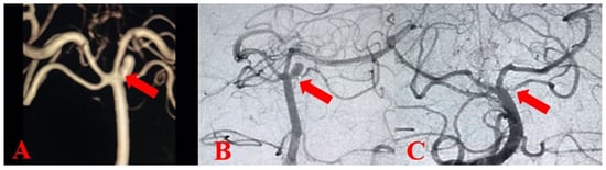 Intracranial aneurysm brain-computed tomography image (A), digital subtraction angiography image of intracranial aneurysm (B), intracranial aneurysm after endovascular coil procedure (C).
