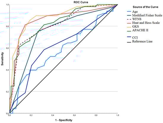 ROC analysis curves of quantitative parameters for mortality. WFNS: World Federation of Neurological Societies Scale, GCS: Glasgow Coma Scale, APACHE II: Acute Physiological and Chronic Health Evaluation II Score, CCI: Charlson Comorbidity Index.