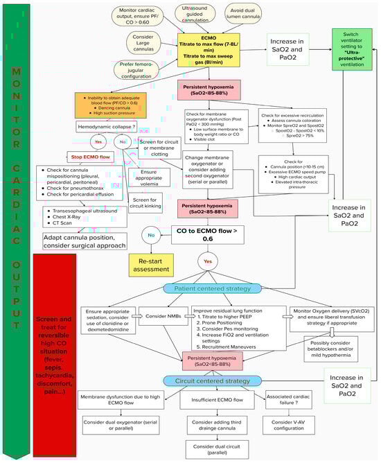 Before diagnosing refractory hypoxemia during vvECMO, technical issues such as a kinked circuit, recirculation, cannula misplacement, or membrane and pump dysfunction must be ruled out first. Once these factors are addressed, refractory hypoxemia can generally be attributed to an imbalance between ECMO flow and the patient’s CO, where the oxygen delivery capacity of the circuit fails to meet the physiological demands of the patient. In vvECMO, part of the venous return goes through the ECMO circuit and is oxygenated to 100%, then returned to the right atrium. The rest (patient venous return), with 60–80% of venous saturation, passes through the pulmonary circulation unaltered. These flows (ECMO and patient’s flow) mix in the right atrium and ventricle, move through the lungs, and determine arterial blood saturation, which is typically 80–90%. ECMO flow must be adjusted relative to total venous return (cardiac output) to optimize systemic oxygen delivery [5].