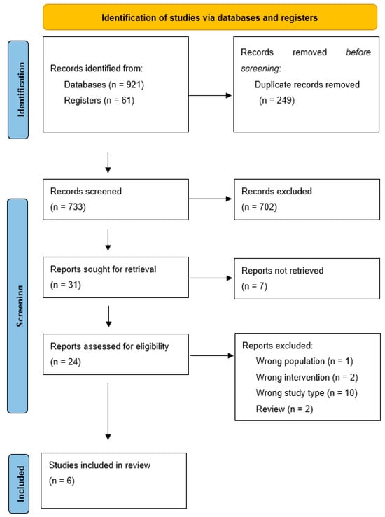 The initial search of the selected online databases and registers provided a total number of 982 articles. After removal of 249 duplicate records, 733 records were screened based on their title and abstract. After exclusion of 702 records due to low relevance based on title and abstract and inability to retrieve 7 reports, the selection process resulted in 24 articles eligible for full-text analysis, with 6 articles finally accepted for qualitative and quantitative analysis [27,28,30,31,32,33]. A flowchart diagram, according to the PRISMA-P guidelines, is presented in Figure 1 [34]. The present meta-analysis included 328 patients (170 patients in the NPWT group and 158 patients in the conventional Non-Pressure Dressings groups).