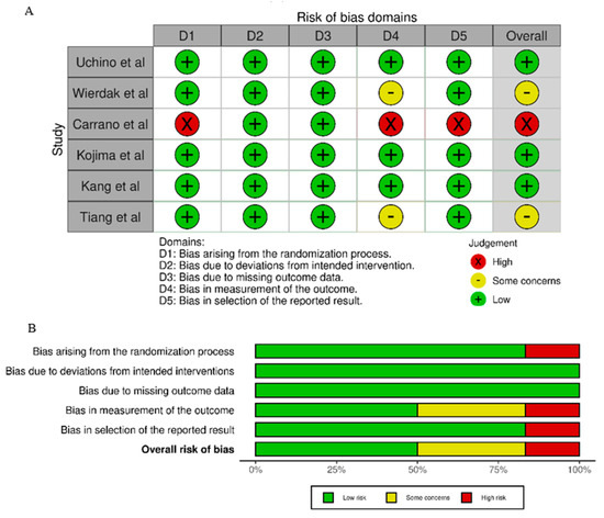 Results of quality assessment are presented in Figure 2A,B. Most studies demonstrated a low risk of bias across all domains. The highest proportion of concerns and high risk was observed in “Bias in the selection of the reported result”, suggesting variability in how outcomes were selected and reported. Similarly, “Bias in the measurement of the outcome” presented some concerns in a subset of studies. Carrano et al. [31] was the only study judged to have an overall high risk of bias, with high risks identified in three domains: randomization process, measurement of the outcome, and selection of the reported result. In contrast, the studies of Uchino et al. [32] and Kojima et al. [30] exhibited a consistently low risk of bias across most domains, demonstrating higher methodological rigor. Finally, the studies of Tiang et al. [27] and Kang et al. [33] had some concerns in specific domains but were otherwise assessed as having an overall low risk of bias.