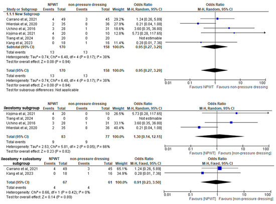 Six studies, including a total of 328 patients (170 in the NPWT group and 158 in the Non-Pressure Dressing group), were included in the analysis of SSI rate. However, the study by Tiang et al. [27] reported 0 events in both arms, rendering its Odds Ratio non-estimable. For the rest of the studies, the pooled OR for SSI using a random effects model was 0.95 (95% CI: 0.27–3.29, p = 0.94), with moderate heterogeneity (I2 = 38%) indicating no statistically significant difference between the NPWT and Non-Pressure Dressing groups. Subgroup analysis on the basis of the type of stoma did not alter the results. In detail, the ileostomy subgroup included four studies with a total of 160 patients (83 in the NPWT group, 77 in the Non-Pressure Dressing group) and the ileostomy+colostomy subgroup comprised of two studies with a total of 128 patients (patients (67 in the NPWT group, 61 in the Non-Pressure Dressing group). In both cases, the analyses revealed no significant difference in SSI rates between the two groups ((OR: 1.30; 95% CI: 0.14 to 12.15, p = 0.82) and (OR: 0.91; 95% CI:0.23 to 3.50, p = 0.89), respectively) (Figure 3).