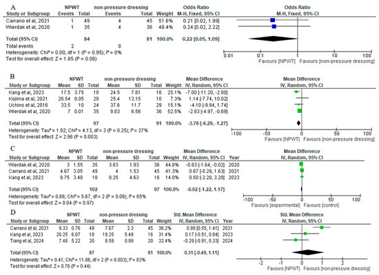 Three studies [28,31,33] with 199 patients (102 in the NPWT group, 97 in the Non-Pressure Dressing group), reported LOS outcomes. No significant difference was found between the two groups (MD: −0.02; 95% CI: −1.22 to 1.17, p = 0.97), with high heterogeneity (I2 = 65%) (Figure 4C).