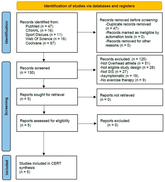 In order to establish these recommendations, it is essential that interventions based on therapeutic exercises are described in sufficient detail. The quality of a study depends on the detail with which its intervention is described [7]. Moreover, a lack of detail makes it impossible to reproduce and apply these protocols [8]. In order to enhance the quality of the description of exercise-based interventions, the Consensus for Exercise Reporting Template (CERT) was developed in 2016 [9]. The CERT checklist can also be employed to evaluate the quality of published interventions. This checklist evaluates essential components of exercise interventions, including exercise intensity, frequency, and individualization, which are critical for ensuring effective rehabilitation. However, it remains unclear whether these key aspects are adequately reported in studies addressing SIS in overhead athletes.
