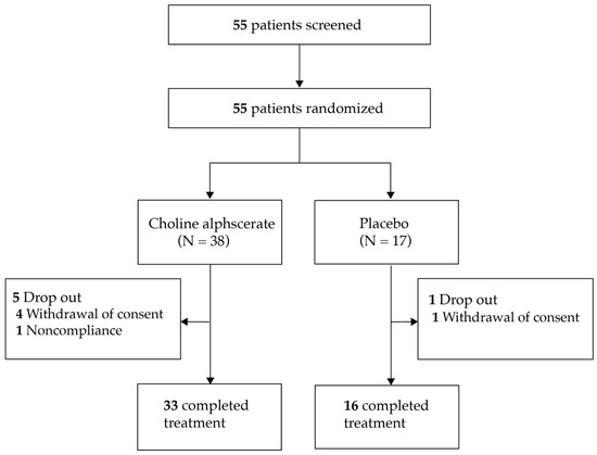 A total of 55 participants were enrolled, and 49 completed the trial (placebo group = 16 and choline alphoscerate group = 33). Eligible participants were recruited between September 2016 and September 2019, and the final study visit was February 2020.