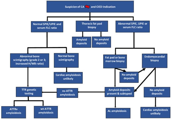 Figure 1). Eligible patients were selected if (1) the “red flag” criteria indicated a possible yet undiagnosed CA or if CA was already diagnosed and (2) the patients had indications of pacemaker or ICD implantation or generator change. The patients who fulfilled these criteria were consecutively included. The indication of pacemaker and ICD therapy followed current guidelines [