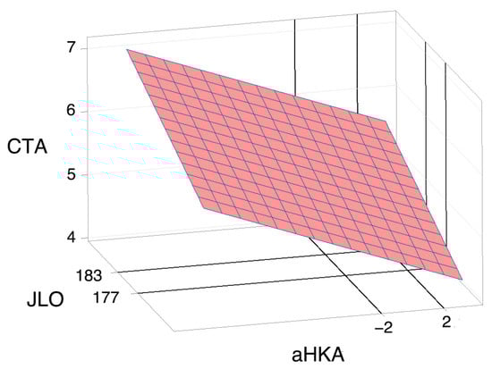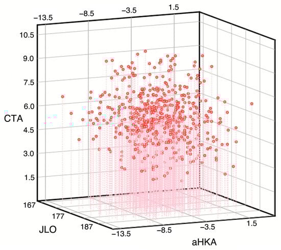 The variables were perfectly uncorrelated according to the regression equation: CTA = −4.45 − 0.0897 aHKA + 0.0540 JLO (r2 = 0.0608). Given the absence of correlation, we obtained a graphical representation that can provide information on the characteristics of the distributions.