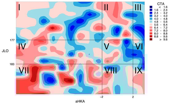 The following contour maps illustrate the distribution of CTA values in the f(aHKA, JLO) plane. In this plane, CTA represents the distal femoral rotation, aHKA represents the arithmetic hip–knee–ankle angle, and JLO represents the joint line obliquity. The Roman numerals correspond with the nine morphotypes of the Coronal Plane Alignment of the Knee (CPAK) classification. The distribution of values for CTA in each section of the plane is demonstrated (the red scale indicates high values of CTA, and the blue scale indicates low values of CTA). Values are in degrees. The image clearly represents the heterogeneous distribution of CTA values on the JLO-HKA plane, that is, of f: R2→R.