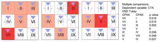 Using ANOVA, we found that there were statistically significant differences between the distributions of the CPAK groups for CTA (F = 5.81; p < 0.001). We calculated Tukey’s comparisons to see which distributions differed statistically, as shown in Figure 5.