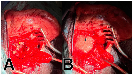 Mastoid obliterative technique with the use of bioactive glass—left ear. (A). Mastoid cavity before obliteration—dashed line. Cartilage and fascia constituting scaffolding for the EAC—yellow arrow (B). Mastoid obliterated with bioactive glass—blue arrow.