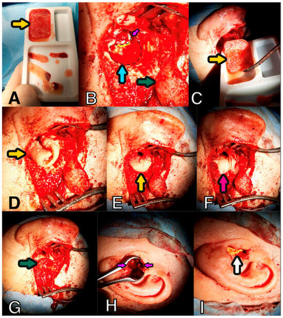 Mastoid obliterative technique with use of sticky bone—left ear. (A) Preparation of sticky bone—yellow arrow. (B) Mastoid cavity before obliteration—dashed line; TM covered with spongostan—dotted line; facial nerve—yellow line; posterior margin of the mastoid cavity—blue arrow; up-pedunculated muscle flap—green arrow. Cartilage used to attic stabilisation and obliteration—violet arrow. (C) Sticky bone moved to the mastoid cavity—yellow arrow. (D) Rolled sticky bone matched to the mastoid cavity—yellow arrow. (E) Final placement of sticky bone—yellow arrow. (F) Sticky bone covered with APRF—pink arrow (G) Up-pedunculated muscle flap moved onto the top of the obliterated cavity—green arrow. (H) Place of the of the EAC cartilage incision—violet arrow. (I) EAC packed with cotton pledge with antibiotic ointment—white arrow.