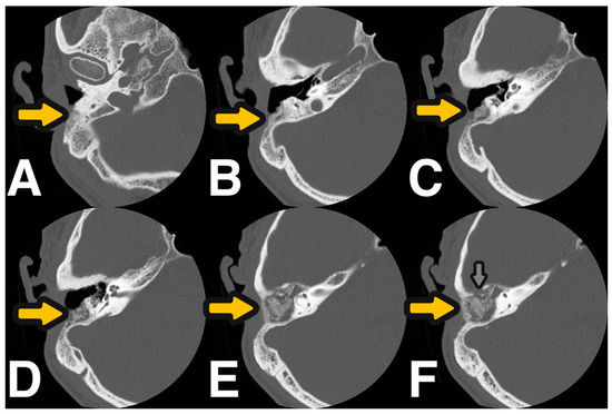 (A–F) Control HRCT-transverse plane scans of the right ear performed six months after mastoid obliteration surgery with use of sticky bone—yellow arrow. (F). Middle fossa bone destruction covered with sticky bone—grey arrow.