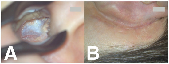 (A) Control otomicroscopy nine months after left ear sticky bone obliterative mastoid surgery. (B) Left ear retroauricular area view.