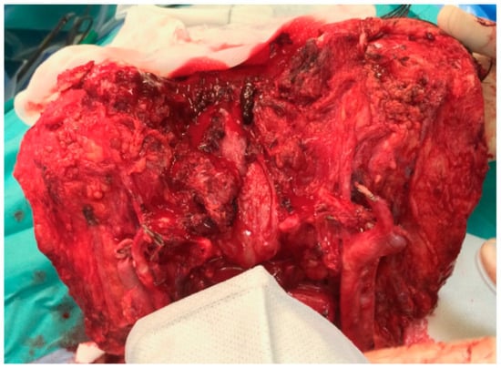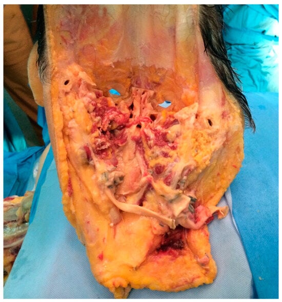 Posterior view of the full-face allograft at the end of the retrieval under a controlled asystole donation. Note that all vessels, nerves and muscles have been identified. The allograft consisted of a full face procurement including the mandible, part of the temporal bone, maxillary and zigomas.