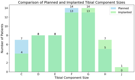Tibial components were exactly matched by the planning for 39 (70.91%) patients, accurately for 12 (21.82%), and inaccurately for 4 (7.27%). The Wilcoxon test was run for the numerical translation of tibial component sizes and yielded a statistic equivalent to 13.00 with p = 0.0028 (<0.05), meaning that the difference between the predicted and implanted groups was statistically significant. The distribution of projected and implanted component sizes is portrayed by Figure 2.