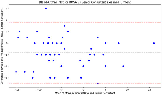 For the axis measurement comparison, the paired differences between consultant and 2D to 3D X-Atlas® measurements were calculated. If there was a coronal plane (varus–valgus) discrepancy between those two measurements, first both planning documents were checked to exclude error during data collection, and then, the absolute difference was calculated (i.e., 2 degrees to varus vs. 3 degrees to valgus would yield a 5-degree difference). Senior consultant measurement were taken as the gold standard [6], while deviations were recorded as the 2D to 3D X-Atlas® planning results. The distribution of the differences was plotted and 4 patients were marked as significant outliers. The measurement of the axis was re-checked by a senior consultant, and confirmed to be the same procedure measured previously. These were excluded from calculating the minimal significant bias of the study, but were included in the rest of the analysis. The normality of the distribution was confirmed by the Shapiro–Wilk test and visual plot. The results were plotted using the Bland–Altman method and a paired t-student test was run, with the mean difference and coronal plane deviation recorded. The threshold for statistical significance for all tests was established to be p = 0.05.