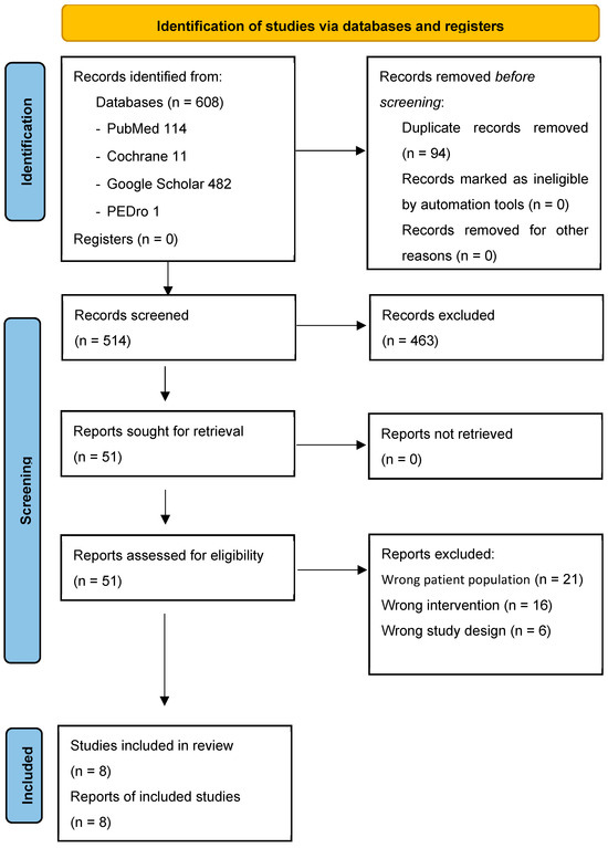 The literature search yielded 608 results, of which 94 duplicates were removed. After screening 514 titles and abstracts, 463 items were removed. A total of 51 articles were fully analyzed, of which 41 were excluded: 21 because the study population did not meet the inclusion criteria, 6 for inappropriate study design, and 16 for inappropriate intervention. Eight articles met all the required eligibility criteria and were included in the study. The PRISMA flowchart is presented in Figure 1.
