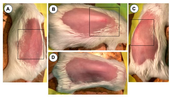 Images of the back of the mice treated with saline and OVA. At 35 days, animals treated with OVA do show dorsal lesions (A–C), while animals treated with saline do not show dorsal skin lesions (D). Areas with lesions are shown in the black box. (A,B,D) correspond to Balb/c mice and (C) to ICR-CD1 mice.