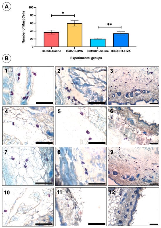 Mast cells result in the histological sections of the dorsal skin at 35 days in the different experimental groups. (A) The histogram shows a significant increase in the number of mast cells in the animals of the OVA-AL group compared to the control (saline) group in both strains of mice. Significant differences in mast cell numbers were observed between mouse strains, both saline- and OVA-treated (see text). (B) Panel of images showing mast cells from histological sections stained with Giemsa from the different experimental groups: Balb/c-OVA (1, 2, 3), Balb/c-Saline (4, 5, 6), ICR-CD1-OVA (7, 8, 9), ICR-CD1-Saline (10, 11, 12). Values are expressed as mean ± standard error of the mean (SEM). The number of animals per experimental group is 5 (n = 5). * p < 0.05 and ** p < 0.01 compared to the control group (saline). Scale bar = 100 µm for all panel images.