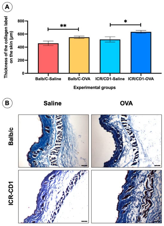 Results of the thickness of Masson’s trichrome labeling in histological sections of the dorsal skin at 35 days across the different experimental groups. Masson’s trichome labeling allows for the visualization of collagen fiber deposition in the skin. (A) The histogram shows that the thickness of this labeling is significantly greater in the OVA-treated experimental groups compared to the saline-treated control groups, in both strains of mice. (B) Panel of images of histological sections from animals in the different experimental groups stained with Masson’s trichrome, showing collagen deposition in both the epidermis and dermis. Values are presented as the mean ± standard error of the mean (SEM). The number of animals per experimental group is 5 (n = 5). * p < 0.05 and ** p < 0.01 compared to the control group (saline). Scale bar = 100 µm for all panel images.
