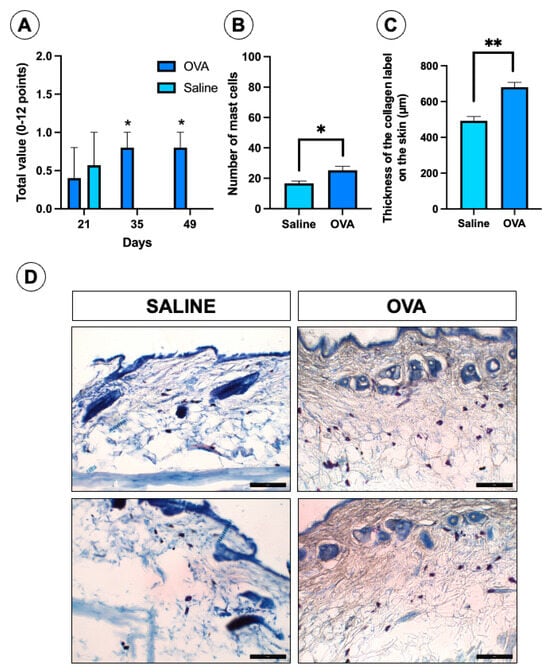 Results of ICR-CD1 mice subjected to OVA and saline treatments up to 49 days of follow-up. (A) Results of the assessment of the degree of skin alterations using the mouse dermatitis score in both experimental groups on the different days of follow-up. (B) Results of the mast cells count in the dorsal skin of both experimental groups at 49 days of follow-up. (C) Thickness of the marking of collagen fibers in the dorsal skin made by staining with Masson’s trichrome at 49 days of follow-up. (D) Panel of histological images of dorsal skin stained with Giemsa, from both experimental groups, in which blue-violet cells can be observed in the dermis, which correspond to mast cells. The quantity of these cells is greater in the images from the OVA group than in those from the saline group. Values are mean ± standard error of the mean (SEM). The number of animals per experimental group is 5 (n = 5). * p < 0.05 and ** p < 0.01 compared to the control group (saline). Scale bar = 100 µm.