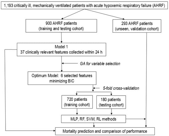 Diagram representing the study design. The flowchart illustrates the scheme for the database of 1193 patients with acute hypoxemic respiratory failure (AHRF), selection of variables for final analysis, machine learning approaches, and comparisons among prediction models. Once the most relevant variables were selected by a genetic algorithm (GA) in the dataset of 900 patients, this dataset was divided into five folders to perform five-fold randomized cross-validation, repeated 100 times using machine learning. AIC: Akaike information criterion, BIB: Bayesian information criterion, MLP: multilayer perceptron, RF: random forest, RL: logistic regression; SVM: support vector machine.
