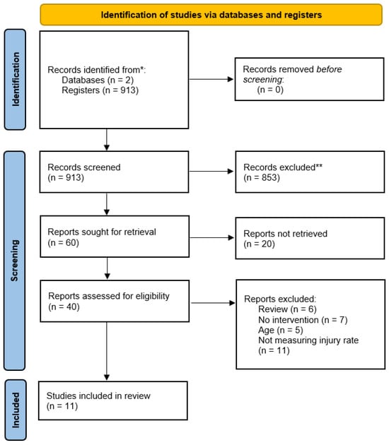 The initial search yielded 913 studies. No duplicates were found and no filters were applied, so none of the records were removed before the screening process. On the first step of selection process, after the screening of titles and abstracts, 873 articles were removed for not complying with the selection criteria, and 60 studies remained for full text screening. Of those, the full text was not available for 20 articles, leaving 40 full texts for the next step of the screening process. Based on the full text screening, six articles were excluded in a review, seven studies did not contain neuromuscular training as intervention, five were excluded because the age of population was not in the range determined as eligible, and a further eleven were excluded because they did not study occurrence of injuries as an outcome. Based on that, only 11 studies were found to be eligible for inclusion in the present systematic review. The selection process is described in the PRISMA flow chart below (Figure 1).