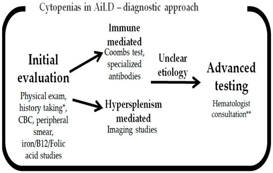 The main issue with cytopenias in AiLD is distinguishing hypersplenism-related cytopenias from immune-mediated ones. The immune-related cytopenias may have isolated deficits in a single cell line and signs of positive antibodies consistent with AIHA, ITP, or AIN, while hypersplenism can cause a general cytopenia with preferential thrombocytopenia initially due to splenomegaly and portal hypertension. Overlap syndromes may cause multiple concomitant cytopenia mechanisms and, therefore, a careful examination of the presented laboratory and clinical data is required [157,158,159]. Figure 1 provides a visual summary of the diagnostic approach to be considered when assessing cytopenias in AiLDs.