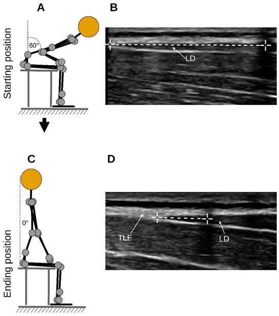 Briefly, each participant sat on a treatment table and flexed their trunk to an approximate flexion angle of 60 degrees (starting position) as determined by the examiner, and here, a static US image was acquired (Clarius L15 HD3, 5–15 MHz Linear Transducer, Vancouver, BC, Canada; Figure 1A,B). Participants then extended their trunk to 0 degrees, which was the ending position of the trunk extension task (TET), and a static, secondary US image was acquired again (Figure 1C,D). The measurement was the distance between the junction of the latissimus dorsi muscle with the TLF and an artificial reference created by reflective tape on the skin shown in the images (Figure 1B,D). The difference between the distances of the starting and the ending position represents the deformation of the TLF (Figure 1B,D).