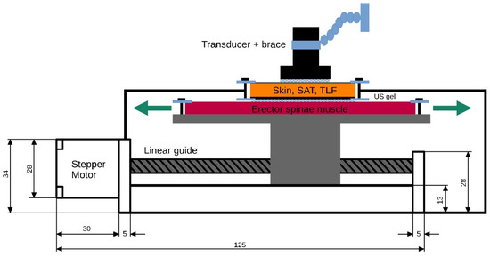 To generate ground truth data for the subsequent validation of the TLFD_US, a custom-built tissue sliding device was constructed. A polyurethane gel pad that mimics the erector spinae muscle is attached to a plateau mounted on a linear actuator (SFU1605-100 mm, Shandong Sair Mechanical Guide Co., Ltd., Gaotang, China) and driven by a high-precision stepper motor (NEMA17, ACT Motor GmbH, Bremen, Germany). This configuration allows the gel pad to move laterally under another gel pad that mimics the skin and SAT (Figure 2).