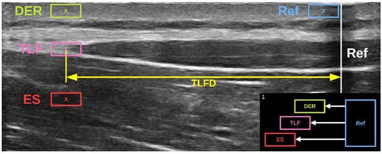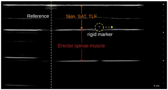 The investigator, who was blinded to the group membership, measured the TLFD sonographically from each participant as described in Section 2.1. A US video of the entire trunk extension task was then recorded from the TLF (for more details on this procedure, see Brandl et al. [23]). The videos were then tracked in post-analysis using Kinovea (version 0.9.5; Kinovea open source project, www.kinovea.org). The tracking pixels from the videos were tested for several scenarios, and Kinovea was recommended as a valid and reliable tool [31,32]. The individual speckle tracking of pixels was applied within a 4 × 7 mm rectangle representing the region of interest as described by Rodriguez et al. [33]. The analysis involved the determination of lateral tissue displacement from the starting to the ending position (Figure 1). The measured pixels were converted to millimeters using the scale bar in the US video and the Kinovea calibration function [31]. The procedure was performed simultaneously by the program for the different lumbar tissue layers (dermis, SAT, TLF, and erector spinae) and the artificial reference in the US video that we had previously defined (Figure 4).