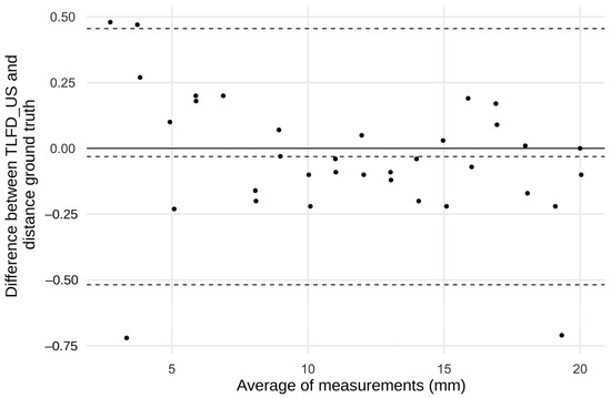 The Bland–Altman plot of the differences between TLFD_US and distance ground truth. TLFD_US, ultrasound measurement of the deformation of the thoracolumbar fascia.