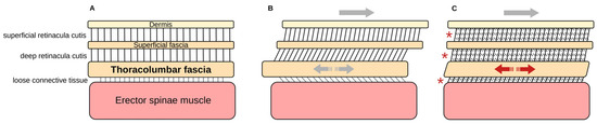A model of thoracolumbar fascia deformation. (A) The extended position of the trunk. (B) Deformation during trunk flexion in healthy individuals. The dermis and the subcutaneous adipose tissue (represented as retinacula and superficial fascia) slide in relation to the TLF, which in turn is relatively fixed by the attached tissues, i.e., the latissimus dorsi muscle, the transversus abdominis muscle and the spinous processes. The erector spinae muscle can slide relatively freely under the TLF. In this respect, deformation is possible with the involvement of the surrounding connective tissue. (C) Deformation during trunk flexion in patients with low back pain. The red asterisks mark possible densification and/or the loss of liquid, which lead to adhesion zones with reduced gliding properties. The TLF cannot deform against the over- and underlying tissue layers. The internal shear stress on the TLF increases. TLF, thoracolumbar fascia.