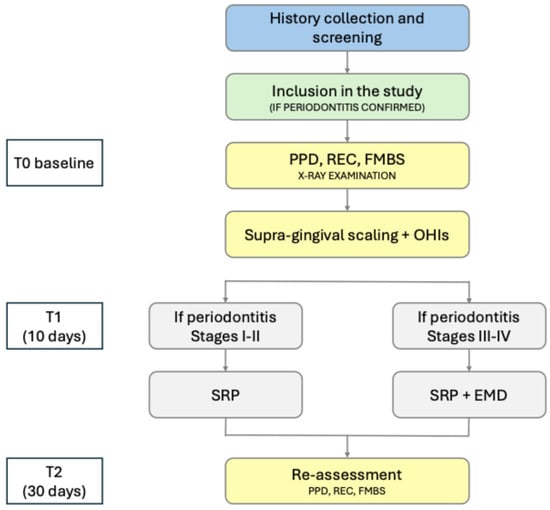 One week after Step 1, subgingival mechanical instrumentation was performed (Step 2). Root surfaces were instrumented with mini-micro curettes (Hu-Friedy, Chicago, IL, USA) and ultrasonic instrumentation with periodontal fine tips (EMS, Nyon, Switzerland) under magnification by the examiner. Local anesthesia was administered when needed. Treatment sessions followed a full-mouth approach (FM-SRP) []. In cases of Stage III and IV periodontitis, sites with deep PPD (>5 mm) were treated with subgingival mechanical instrumentation with the application of enamel matrix derivatives (EMD) (Emdogain® FL, Institut Straumann AG, Basel, Switzerland) as already been described []. Patients were then reassessed three months (90 days) after subgingival instrumentation. During this period, patients attended monthly recalls for plaque control and polishing. The study protocol is depicted in Figure 1.