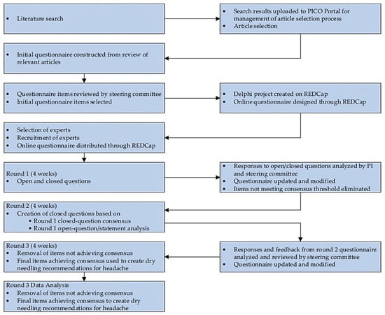 According to the Mass General Brigham (MGB) Institutional Review Board, the current project meets the criteria for exemption and was approved by the MGB Research Information Security Office (protocol #2024P001341). In addition, this protocol is registered on Open Science Framework (OSF) (https://doi.org/10.17605/OSF.IO/VBSY9). This study will implement a three-round Delphi design in accordance with the Guidance on Conducting and Reporting Delphi Studies (CREDES) (see Table S1) and other recommendations [61,62,63] along with direction from published Delphi studies in rehabilitation [18,40,64,65]. This study will consist of three rounds of online questionnaires sent to an expert panel of clinicians and researchers, both nationally and internationally. A systematic literature review of articles related to DN for headache was initially performed across several databases to inform the selection of survey items. A combination of closed and open-ended questions was developed to guide the first round of the survey. A steering committee has been established, and prior to the production phase of the Delphi, the committee will assess the study methodology, assess the initial survey items synthesized from the literature search, and provide any further recommendations for items to inform the first round, and subsequent rounds, of the Delphi study. This expert committee consists of six academic and clinical experts from the following countries: Spain, Denmark, Italy, Belgium, and the United States. Each committee member has over ten years of clinical and academic experience, has declared no conflicts of interest and has published on the topics of headache and/or dry needling extensively. After collection of participants’ responses and feedback from the first round and other rounds, the questionnaire will be refined and reissued to progress toward probable consensus.
