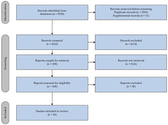 Following removal of duplicates, 6233 articles remained. After the screening of titles and abstracts, 6125 were excluded, leaving 108 for full-text review. Articles were excluded for the following reasons based on our inclusion criteria: wrong study design, not a dry needling study and article not in English. Finally, 16 articles fully met the inclusion criteria [7,42,43,54,55,74,75,76,77,78,79,80,81,82,83,84]. Figure 2 below presents the study selection process.