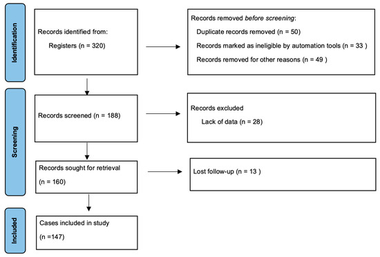 This retrospective cohort study was conducted on patients with a diagnosis of RCC who received targeted treatment with tyrosine kinase inhibitors (50 mg/day sunitinib for 4 weeks followed by a pause of 2 weeks and 800 mg/day pazopanib) between 2011 and 2021 in the oncology departments of Adana City Hospital and Kocaeli University’s Faculty of Medicine. This study was approved by the local ethics committee of Adana City Hospital (1204/30 December 2020). Based on the results of a reference study [22], the minimum number of samples planned to be included in the study was determined as 117, with an effect size of 0.30, a 95% confidence interval and 90% power, calculated according to the chi-square test. The sample size was assessed by using the G*power 3.1.9.4 programme. During the study period, the files of 320 patients diagnosed with RCC were scanned. A total of 147 patients subject to target therapy with tyrosine kinase inhibitors were included in the study according to the inclusion and exclusion criteria. Patients younger than the age of 18 years, those with non-metastatic RCC, and those with secondary malignancy or autoimmune disease, heart failure, active inflammation, and inflammatory disease were excluded from the study, in addition to patients lacking sufficient clinical information. The selection procedure is presented in the flow chart in Figure 1.
