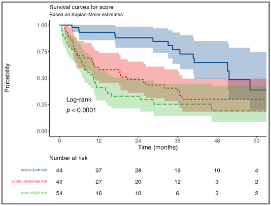 Survival curves according to combined risk scoring (Kaplan–Meier).
