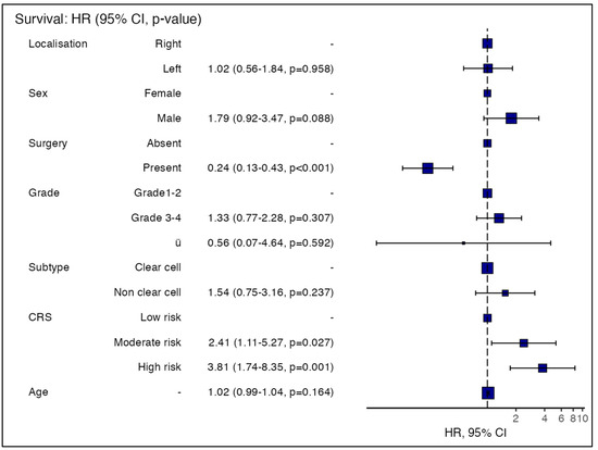Cox regression analysis to predict mortality risk in RCC patients was found to be significant (p < 0.001). The independent variables of the model were age, sex, primary surgery status, tumour location, grade, histological subtype, and CRS. In univariate and multivariate analyses, it was observed that the patient’s history of nephrectomy and CRS were found to be effective indicators of mortality in the models. It was observed that the mortality risk in patients who underwent surgery during the follow-up period was 4.16 times lower (HR = 0.24). Moreover, compared to the low-risk group, the mortality risk was 2.42 times higher in the moderate-risk group and 3.76 times higher in the high-risk group (Table 5 and Figure 3).