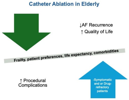 Catheter ablation (CA) has emerged as an effective option for AF management, particularly in symptomatic, drug-refractory cases. Studies such as CASTLE-HF [] and CABANA [] have demonstrated the benefits of ablation in reducing AF recurrence and improving the quality of life. However, the procedural risks are heightened in patients over 75 years, necessitating a careful risk–benefit analysis. For frail individuals, the decision to pursue ablation should be informed by patient preferences, life expectancy, and the presence of comorbidities [,] (Figure 1).